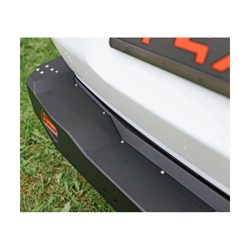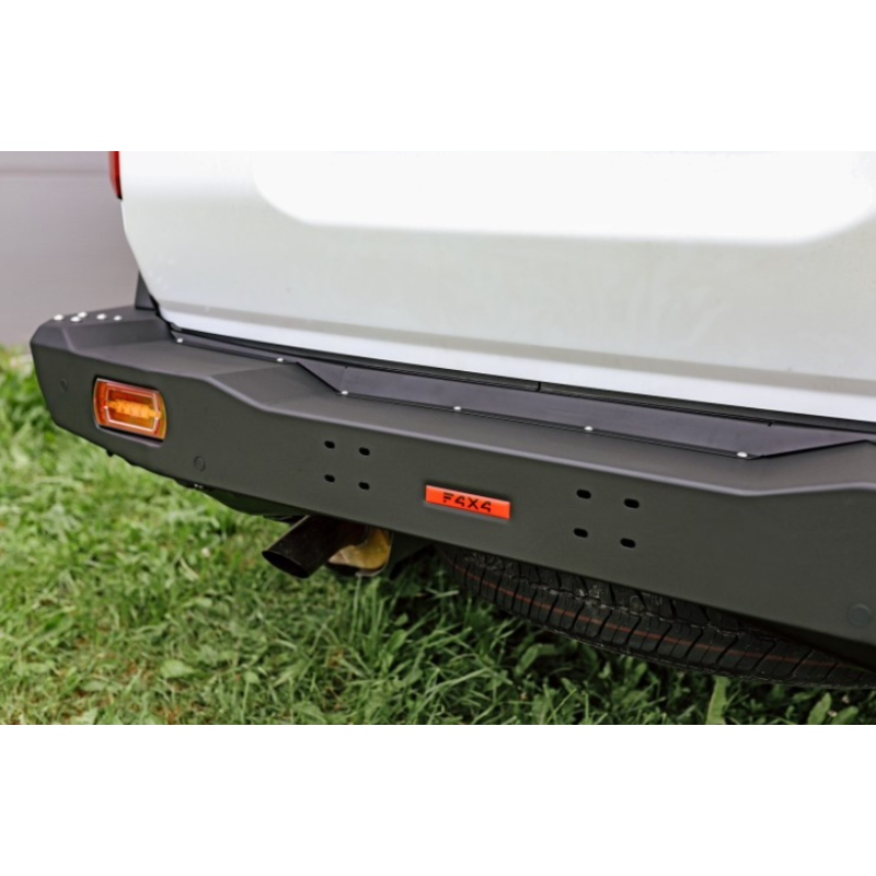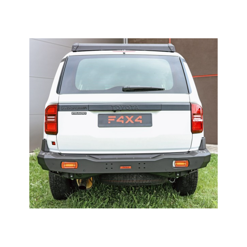 Metalinis galinis bamperis visureigiui Toyota Land Cruiser Prado J250 2023-. Bamperis turi integruotus galinius LED žibintus ir montažines angas ąsų laikikliams prisukti (asų laikikliai komplektuojami už papildomą kainą).