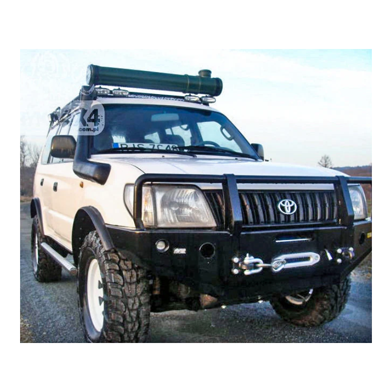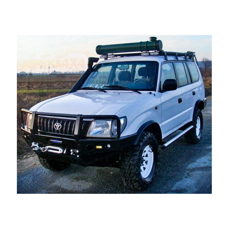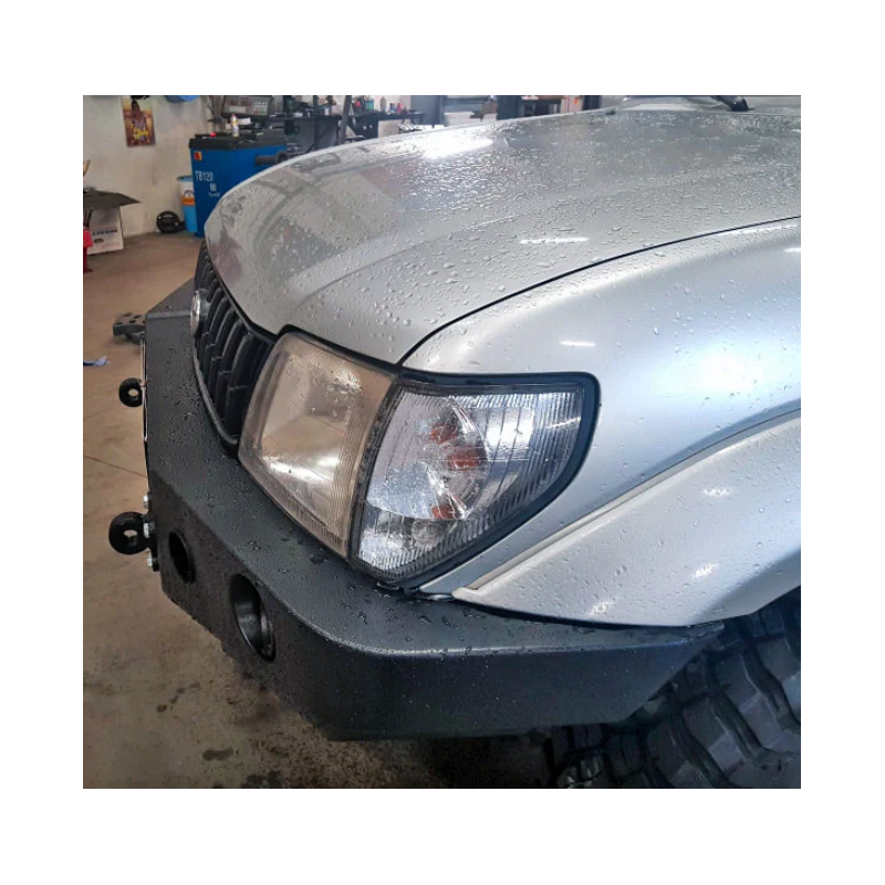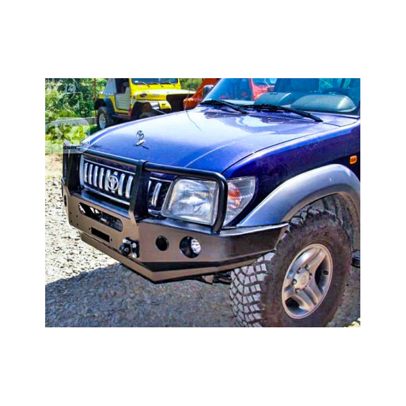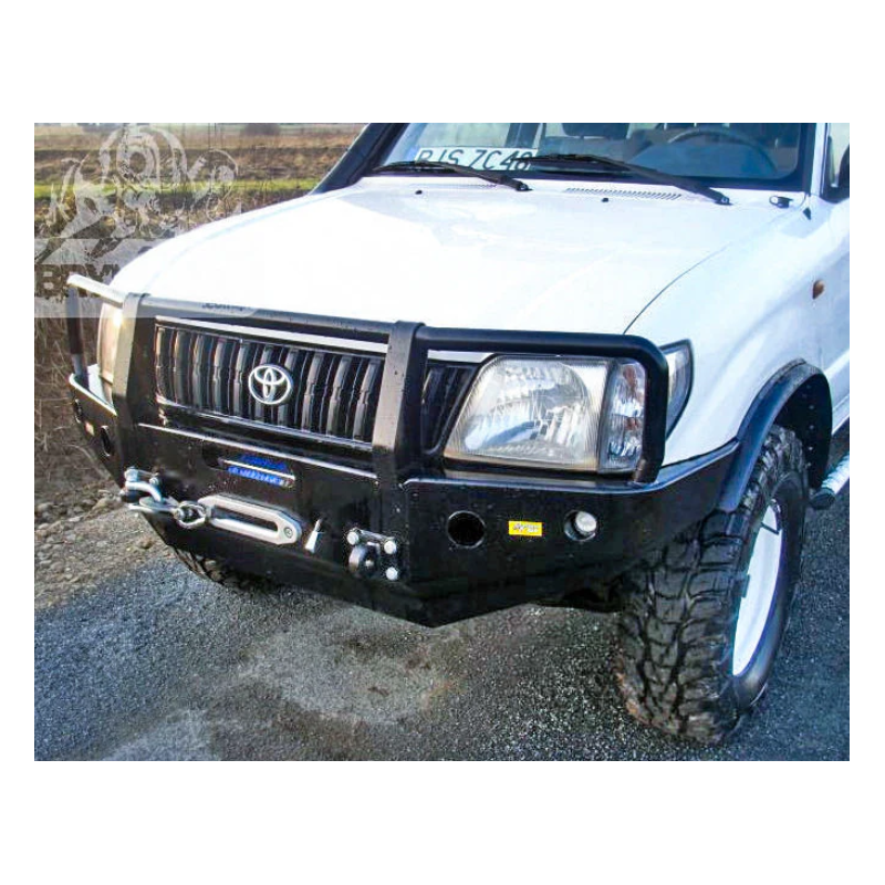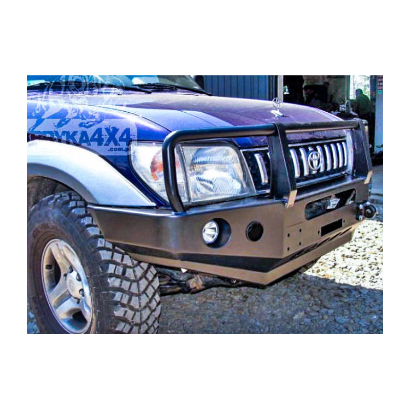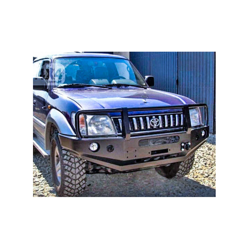 Metalinis priekinis bamperis su vieta gervei visureigiui Toyota Land Cruiser Prado J90, J95 1996-1999 (pre-facelift). Bamperis gali būti komplektuojamas su prisukamais saugos lankais.
