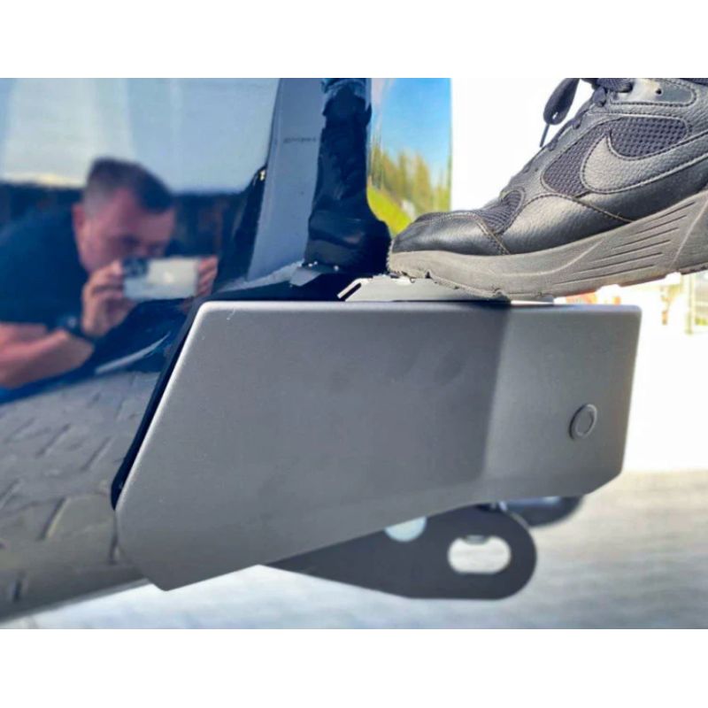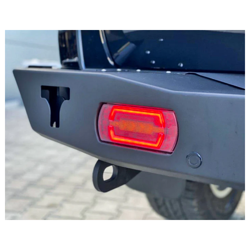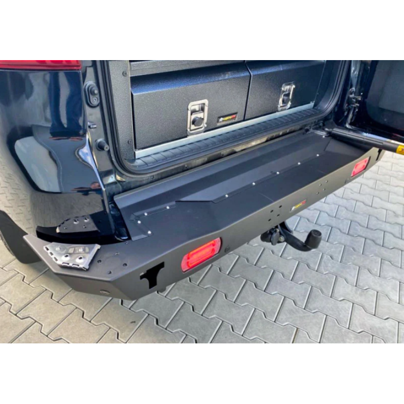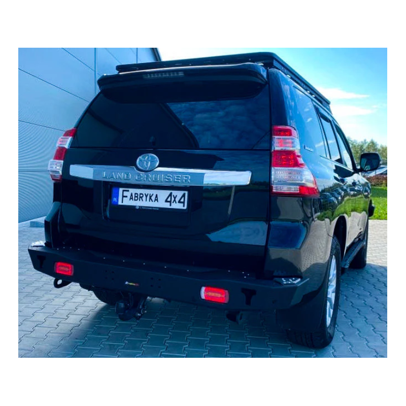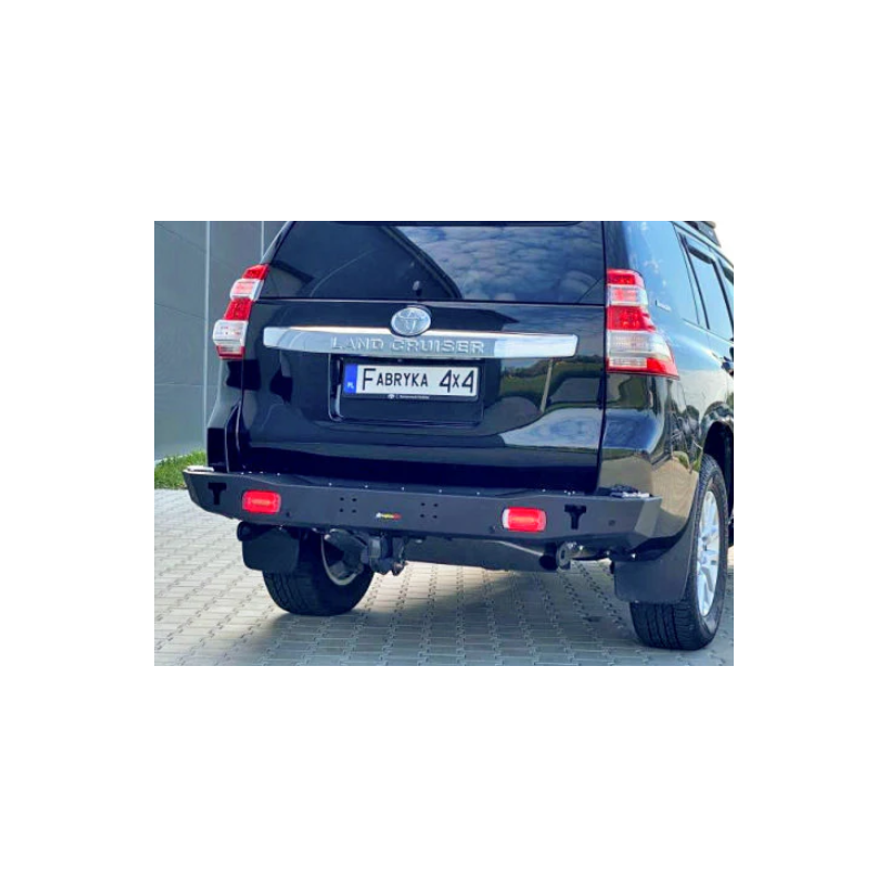 Metalinis trumpas galinis bamperis visureigiui Toyota Land Cruiser Prado J150, J155 (pritaikomas Lexus GX 460) 2013-2017 (1st facelift). Bamperis turi integruotus galinius LED žibintus, montažines angas ąsų laikikliams prisukti ir angas keltuvui Hi-Lift užkabinti (asų laikikliai komplektuojami už papildomą kainą).