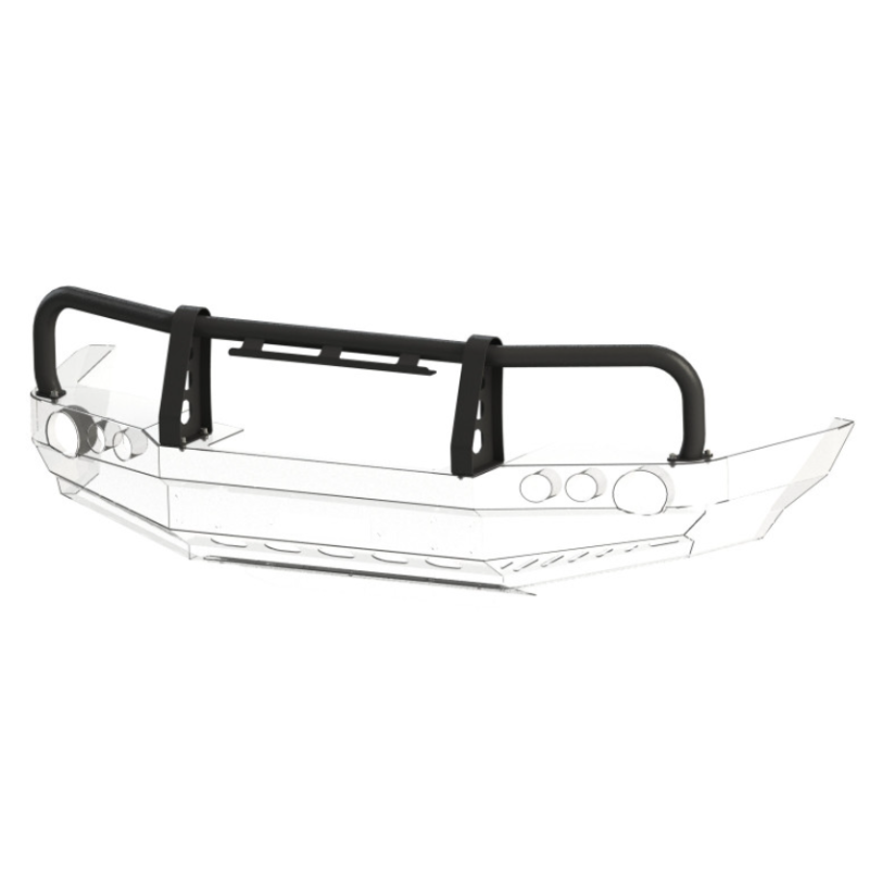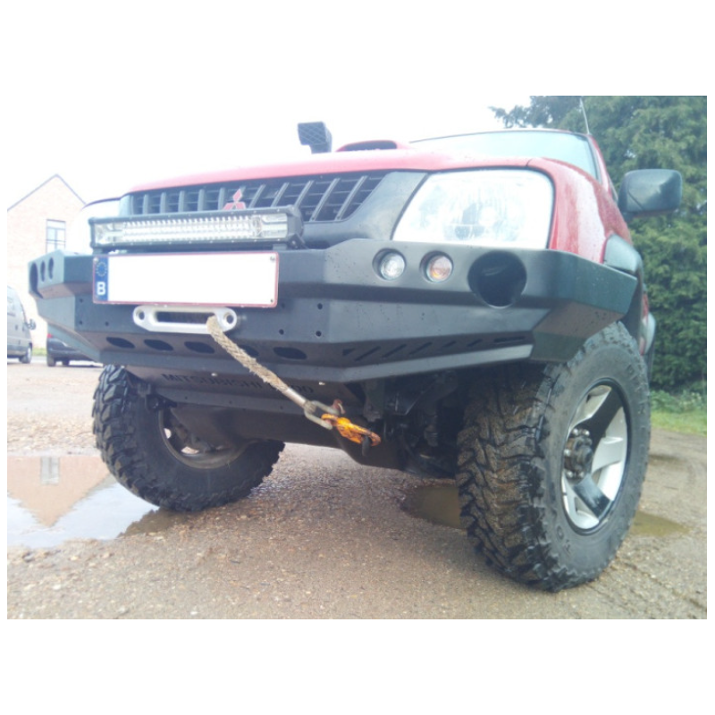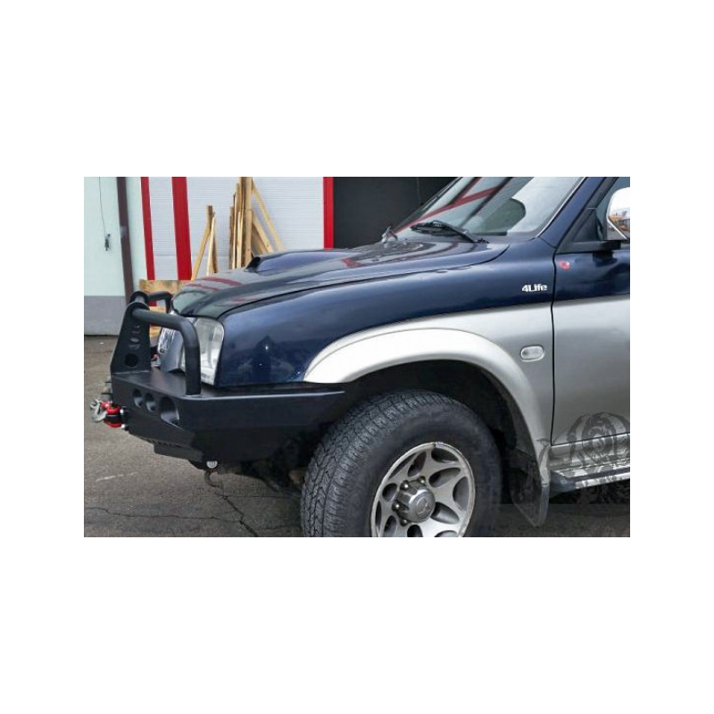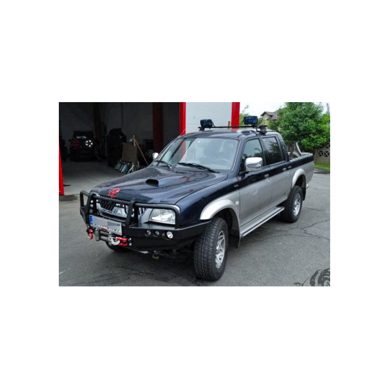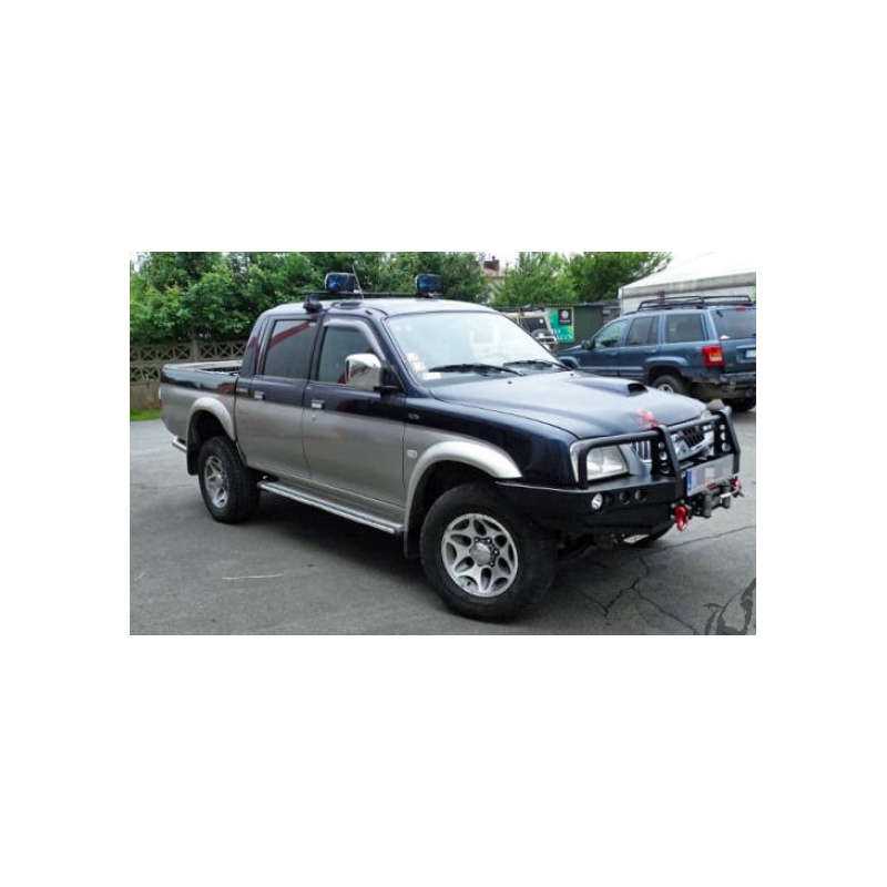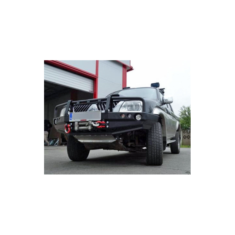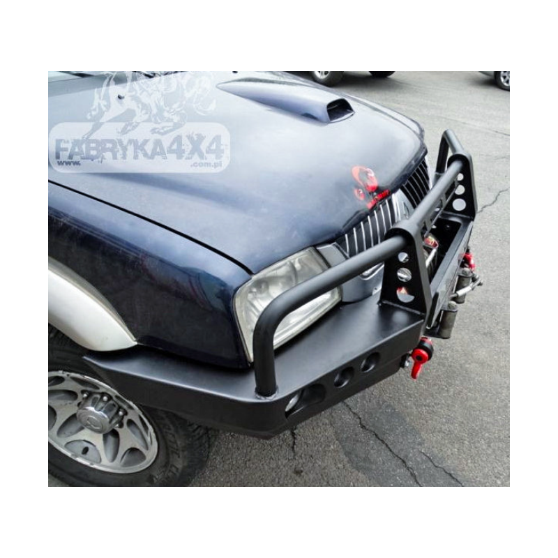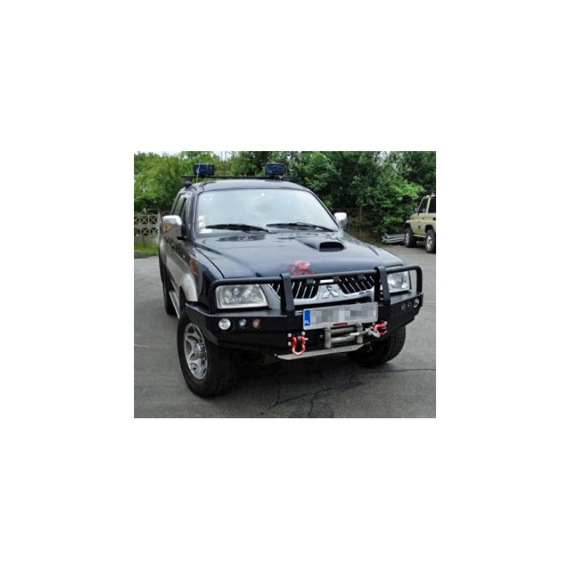 Metalinis priekinis bamperis su vieta gervei visureigiui Mitsubishi Triton L200 K50/K60/K70 1996-2006. Bamperis gali būti komplektuojamas su prisukamais saugos lankais.