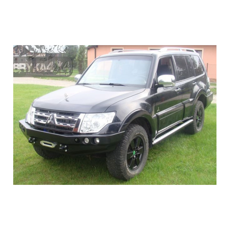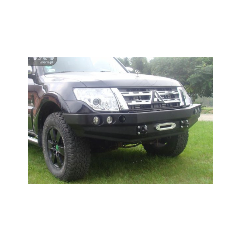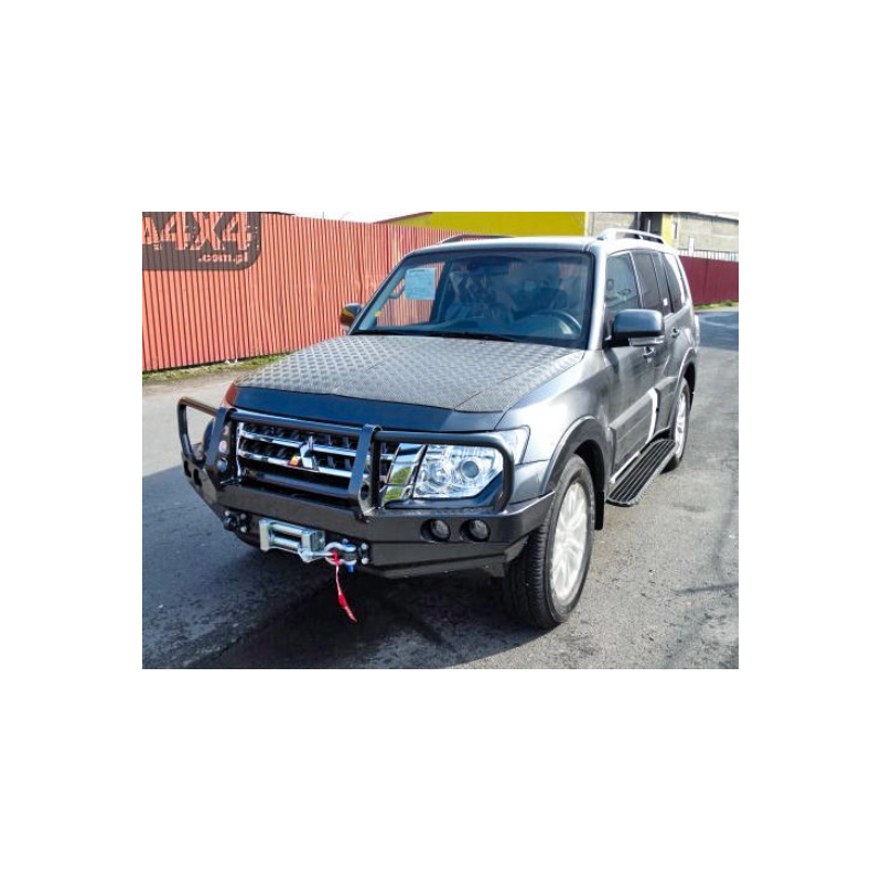 Metalinis priekinis bamperis su vieta gervei visureigiui Mitsubishi Pajero/Montero/Shogun IV V80/V90 2006-2021. Bamperis gali būti komplektuojamas su prisukamais saugos lankais.