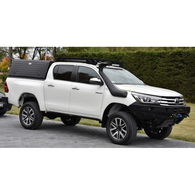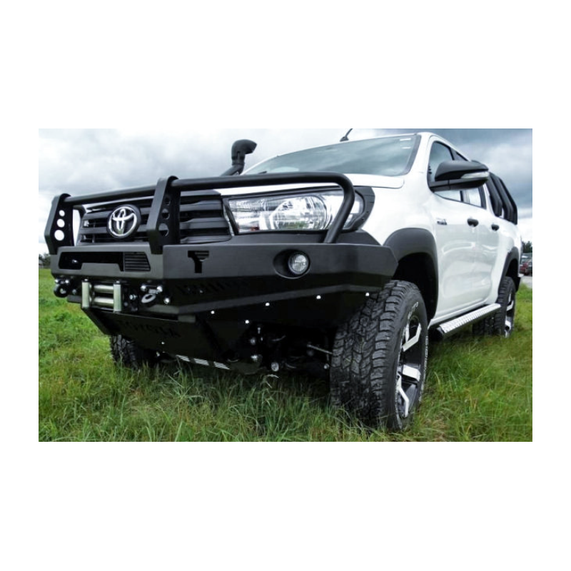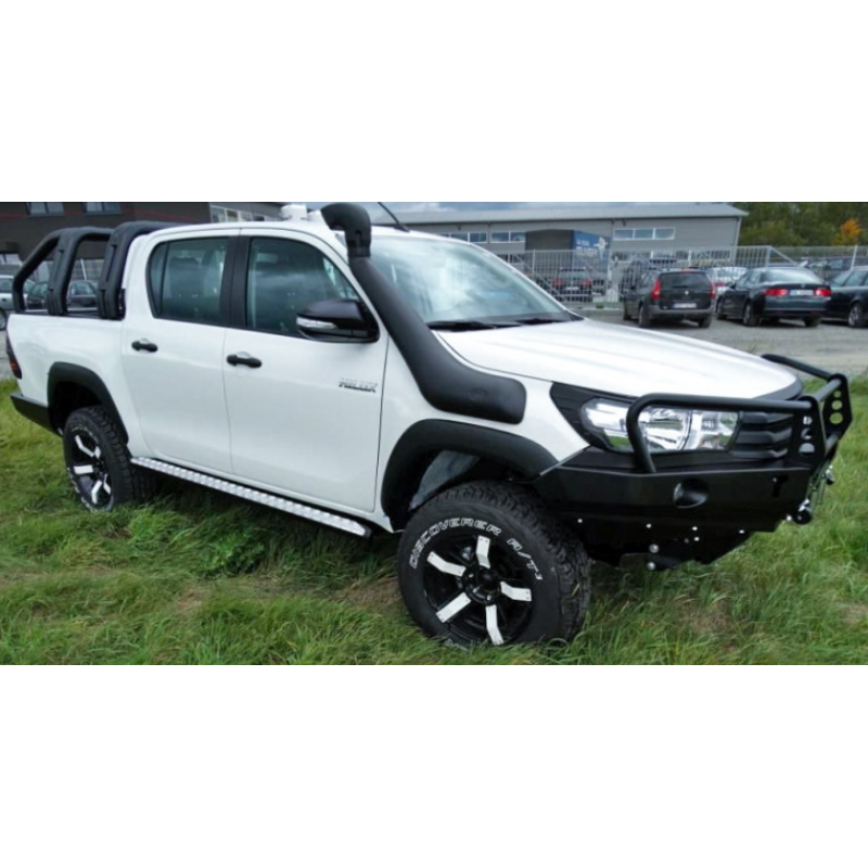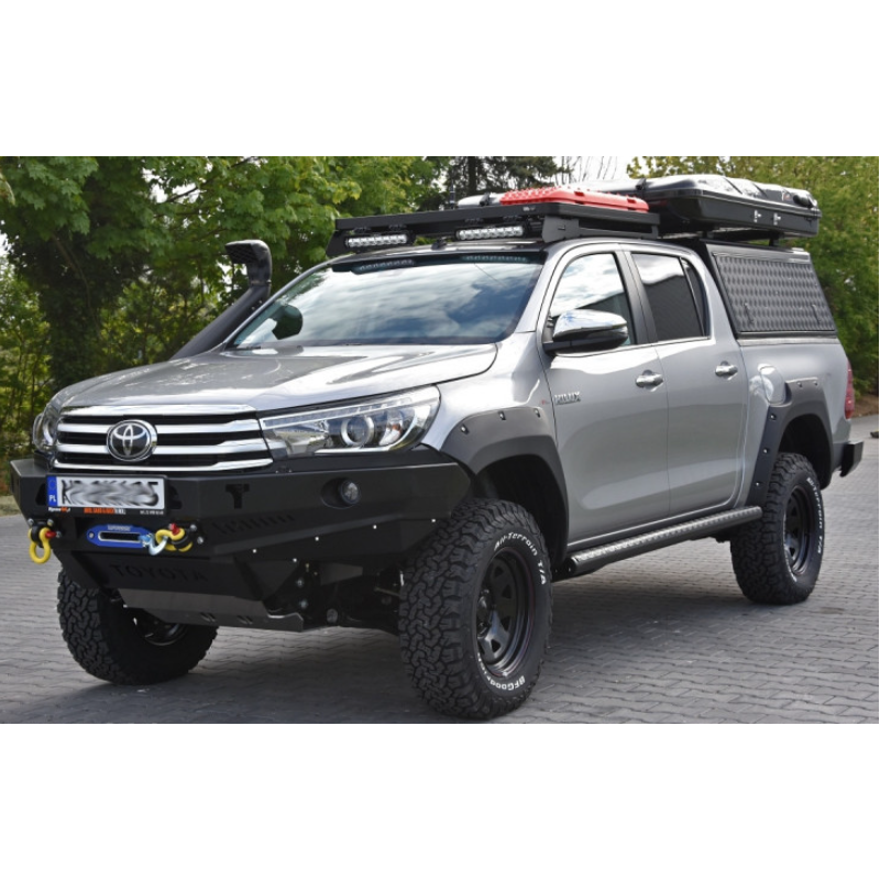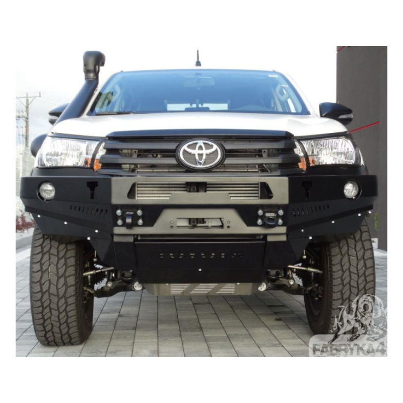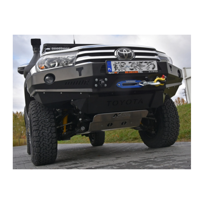 Metalinis priekinis bamperis su vieta gervei visureigiui Toyota Hilux Revo AN110, AN120, AN130 2015-2020. Bamperis gali būti komplektuojamas su prisukamais saugos lankais.