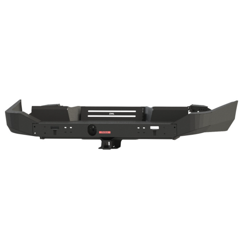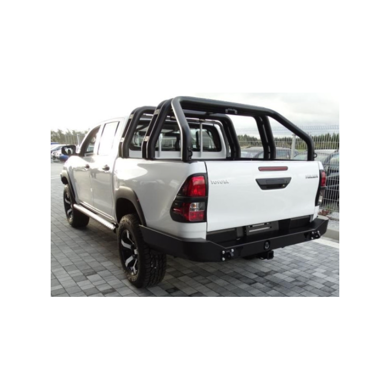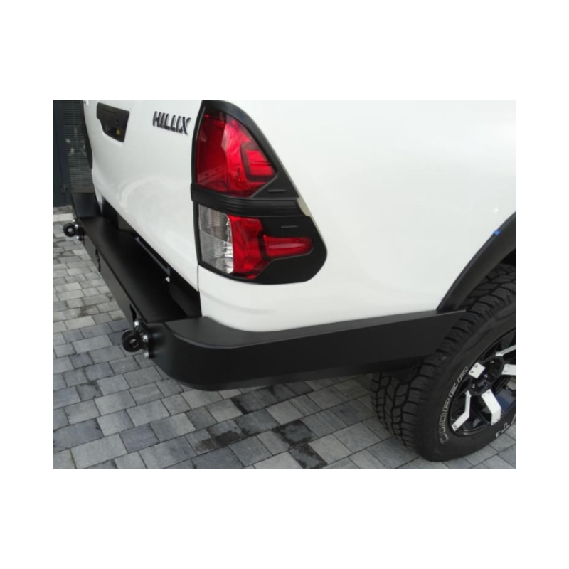 Metalinis ilgas galinis bamperis visureigiui Toyota Hilux Revo AN110, AN120, AN130 2015-2020. Bamperis yra su priekabos sukabinimo lizdu ir anga priekabos kištukiniam lizdui.