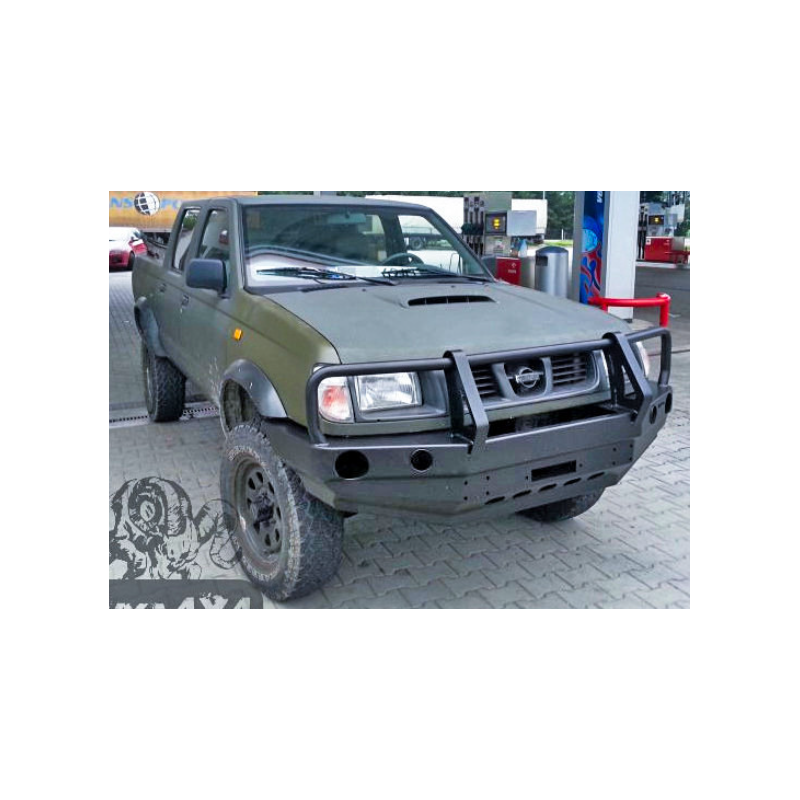 Metalinis priekinis bamperis su vieta gervei visureigiui Nissan Navara/NP300/PickUp/Hardbody D22 1997-2000 (pre-facelift). Bamperis gali būti komplektuojamas su prisukamais saugos lankais.