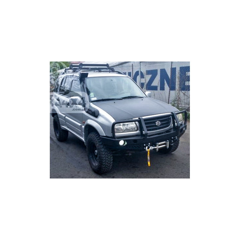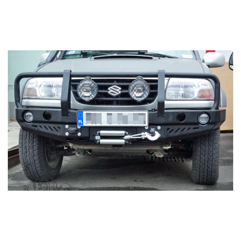 Metalinis priekinis bamperis su vieta gervei visureigiui Suzuki Grand Vitara I FT/GT 1998-2005. Bamperis gali būti komplektuojamas su prisukamais saugos lankais.