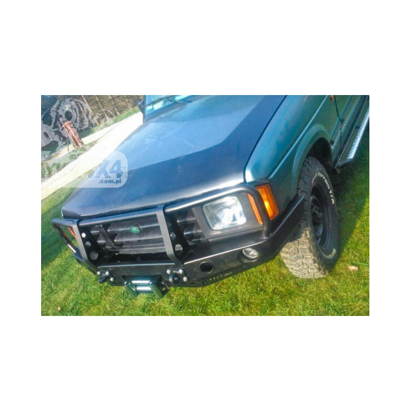 Metalinis priekinis bamperis su vieta gervei visureigiui Land Rover Discovery Series I 1989-1998. Bamperis gali būti komplektuojamas su prisukamais saugos lankais.