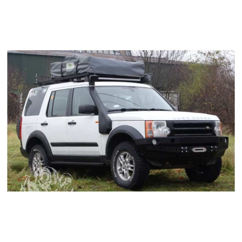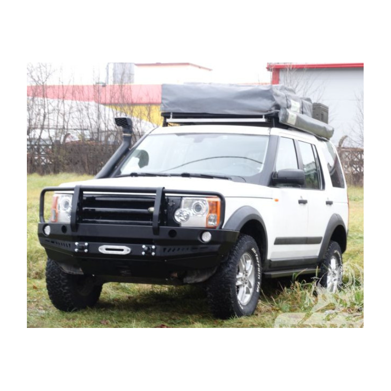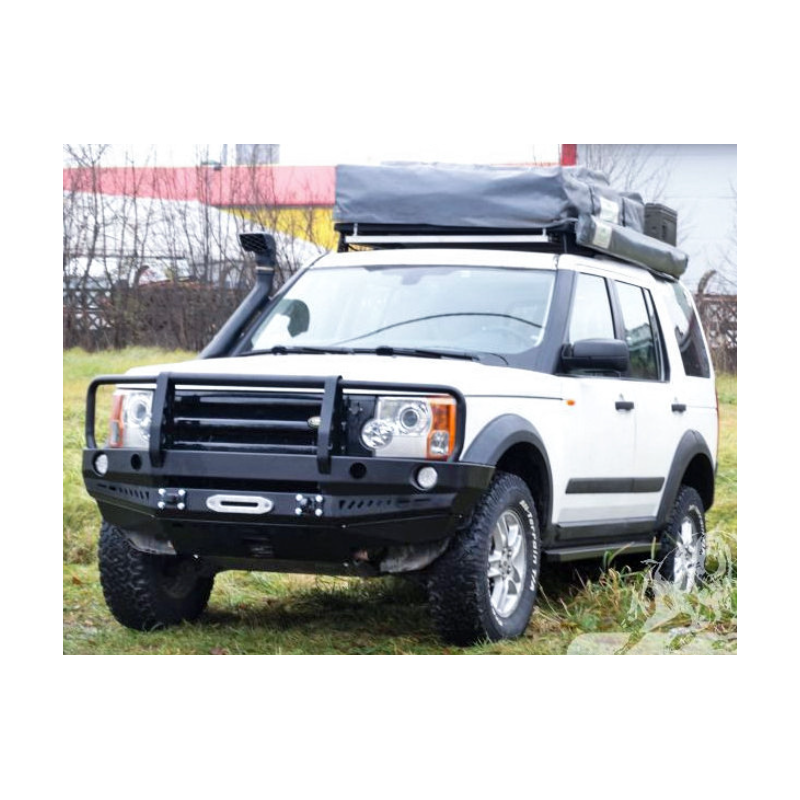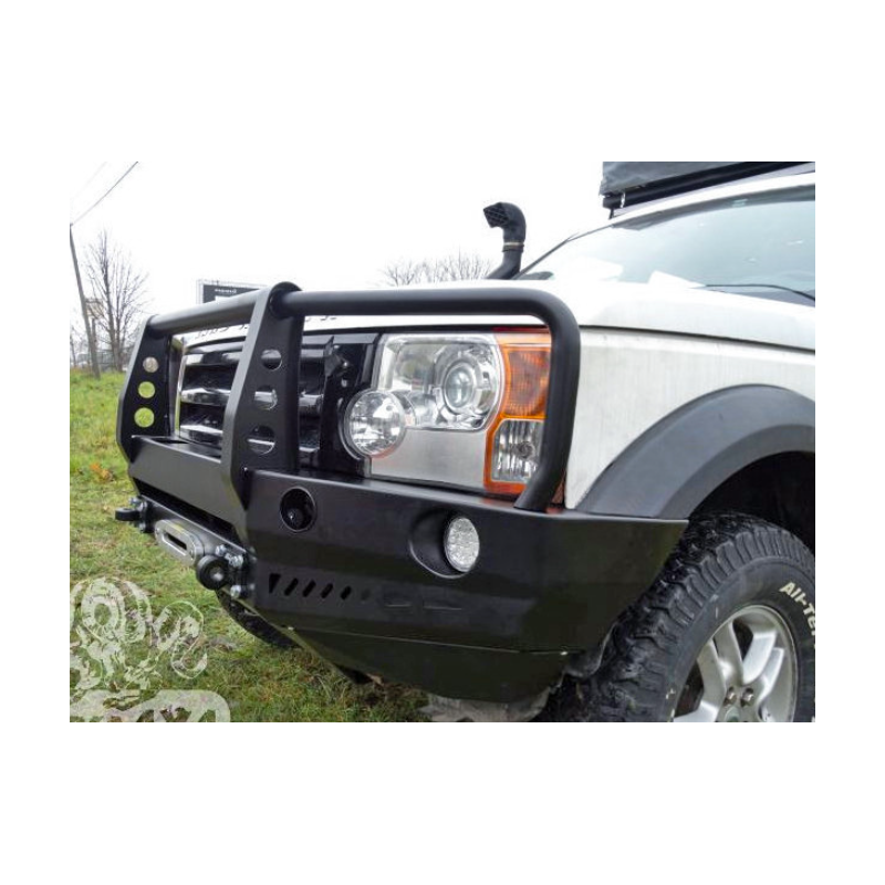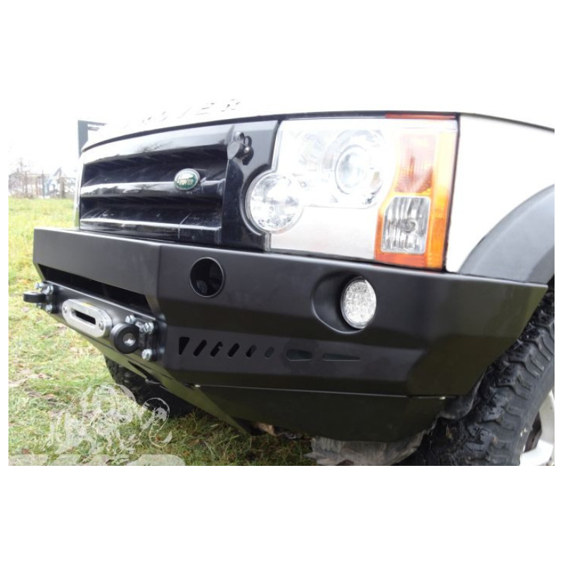 Metalinis priekinis bamperis su vieta gervei visureigiui Land Rover Discovery Series III L319 2004-2009. Bamperis gali būti komplektuojamas su prisukamais saugos lankais.