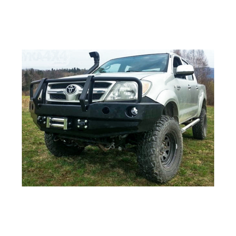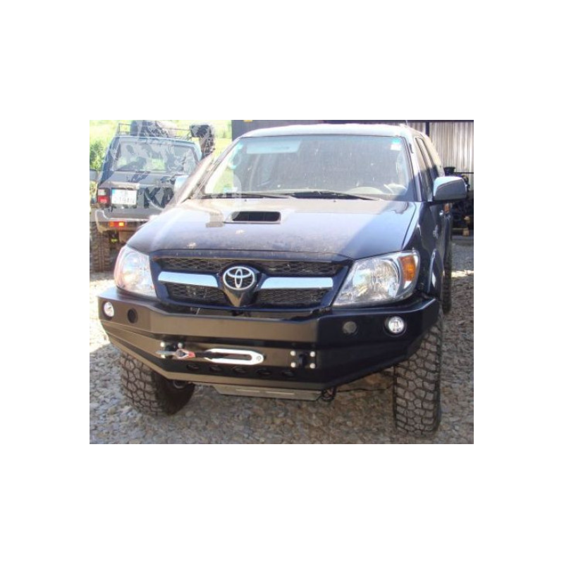 Metalinis priekinis bamperis su vieta gervei visureigiui Toyota Hilux Vigo AN10, AN20, AN30 2005-2008 (pre-facelift). Bamperis gali būti komplektuojamas su prisukamais saugos lankais.