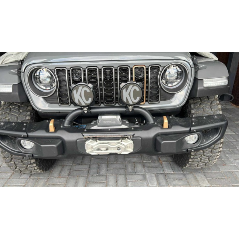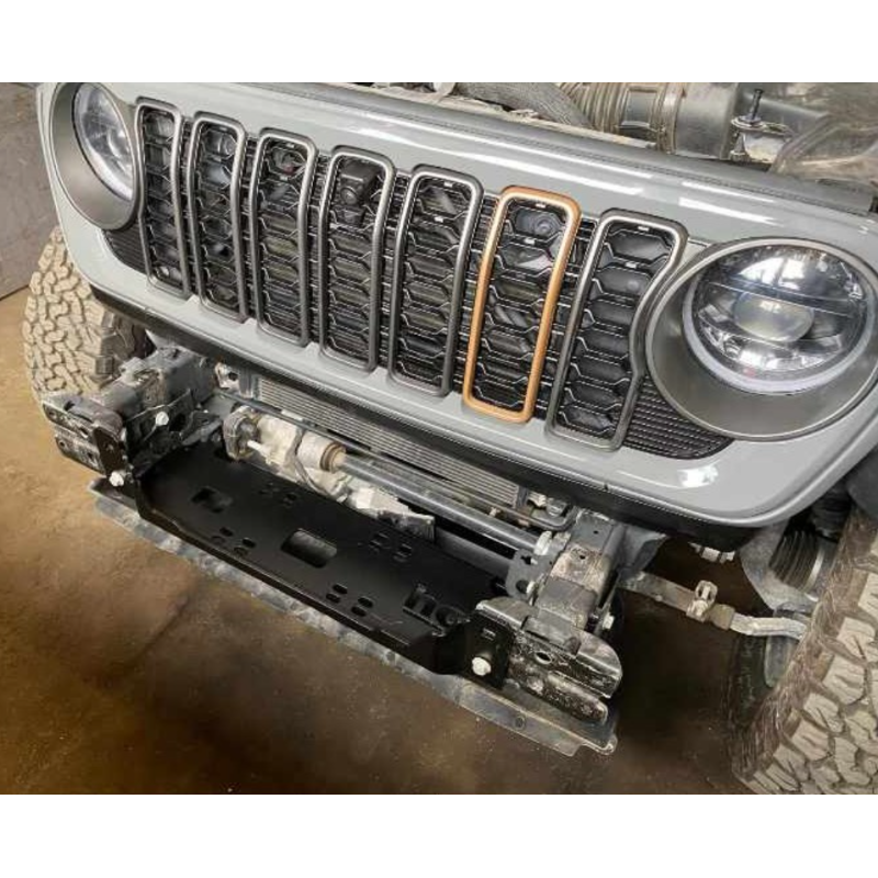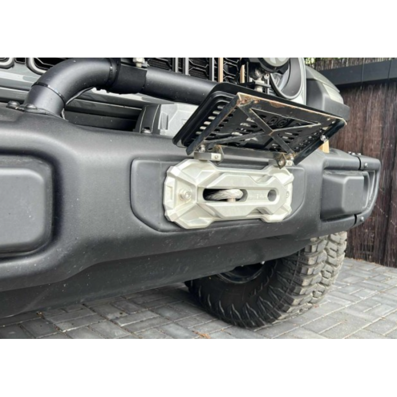 Jeep Wrangler IV JL/JLU 2018- gervės padas, skirtas montuoti gervę originaliame "anniversary" metaliniame bamperyje ir jo kopijose (tinka gervėms iki 12500 lbs). Padas turi visas reikalingas kiaurymes tvirtinimui, gervės ir troso kreipiančiujų tvirtinimui.