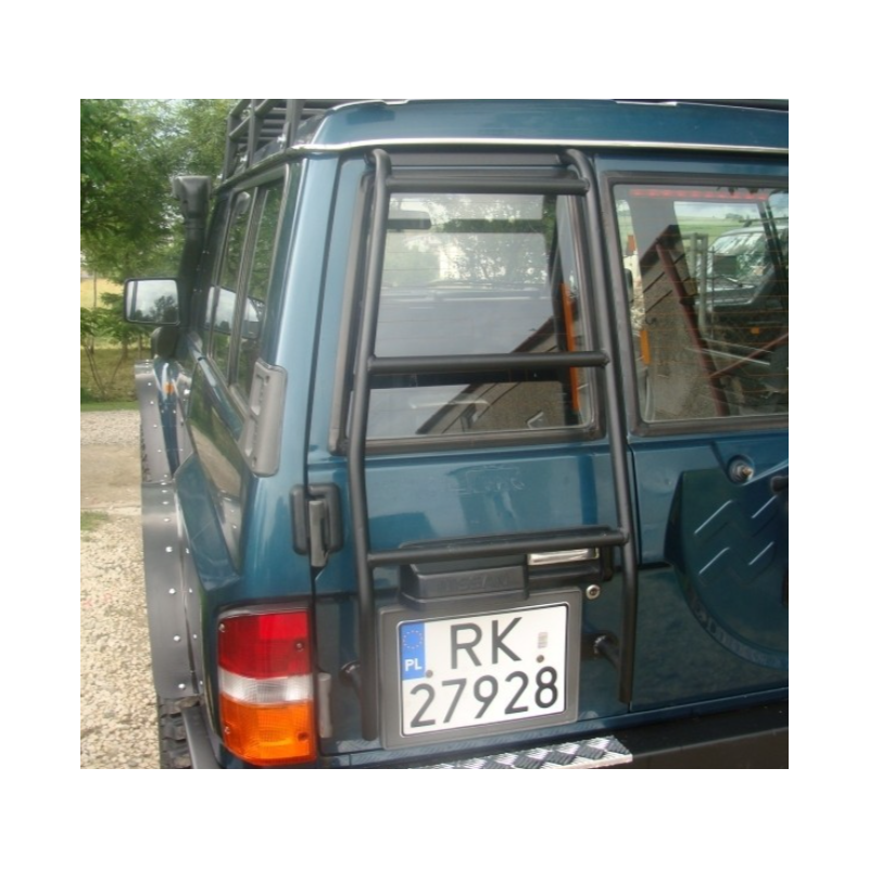 Kopėčios visureigiui Nissan Patrol Y60 GR/GQ 1989-1998. Kopėčios padeda greitai ir patogiai užlipti ant visureigio stogo bagažinės. Kopėčios kabinamos ant bagažinės durų ir apačioje prisukamos varžtais.