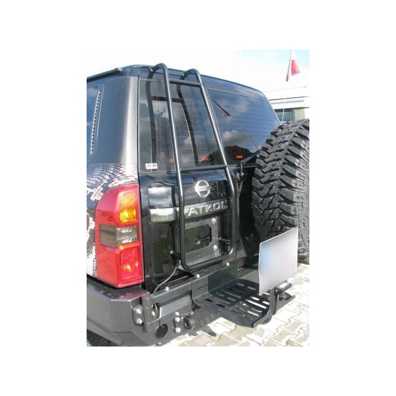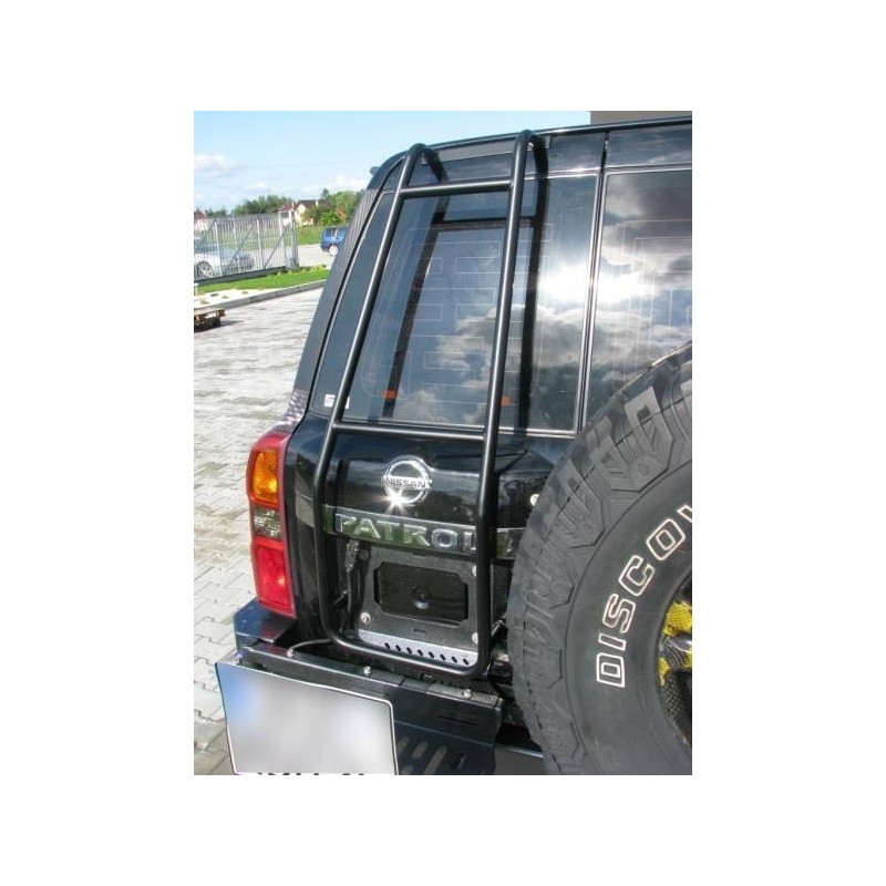 Kopėčios visureigiui Nissan Patrol Y61 GR/GU GU4 2004-2024. Kopėčios padeda greitai ir patogiai užlipti ant visureigio stogo bagažinės. Kopėčios kabinamos ant bagažinės durų ir apačioje prisukamos varžtais.