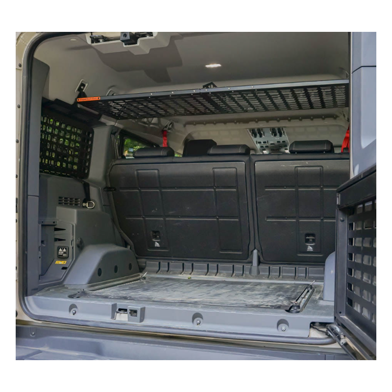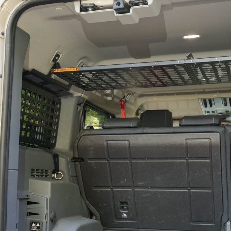 Ineos Grenadier daiktų lentyna "Molle Panel" iš plieno. Skirta patogiai tvirtinti ir pervežti salono viduje palubėje įvairius daiktus, kuriuos galima tvirtinti laikiliais, diržais, varžtais.
