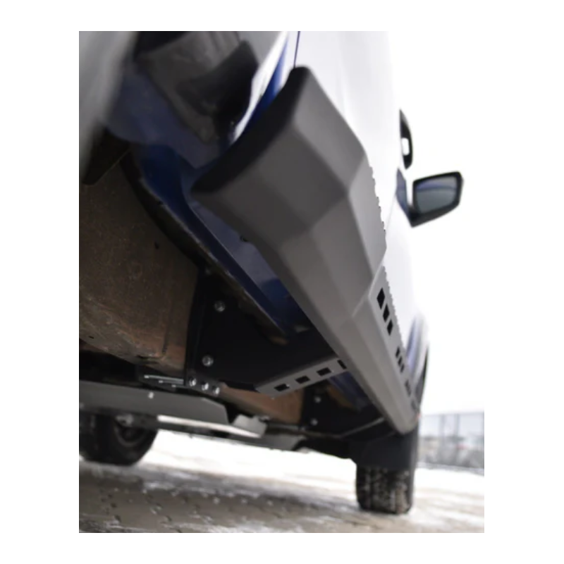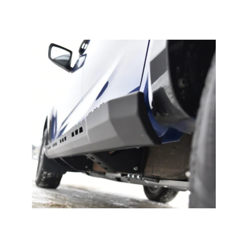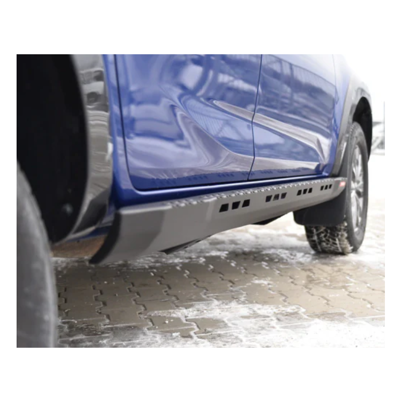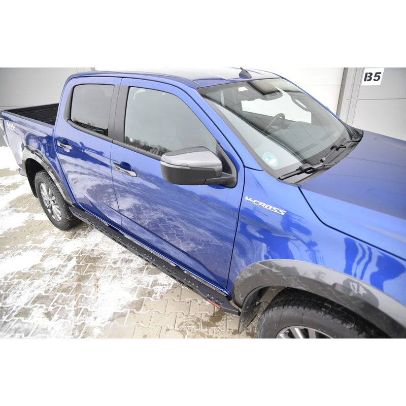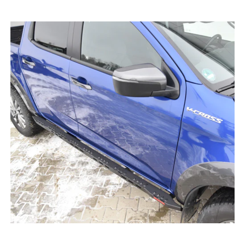 Sustiprinti plieniniai slenksčiai visureigiui Isuzu D-Max RG01 2020-. Slenksčiai leidžia kelti visureigį Hi-Lift tipo domkratais. Slenksčiai apsaugo automobilį nuo išsikišusių medžių šakų, akmenų ar kitų kliūčių kelyje. Taip pat jie padeda įlipti ir išlipti, o perforuotas paviršius apsaugo nuo paslydimo.