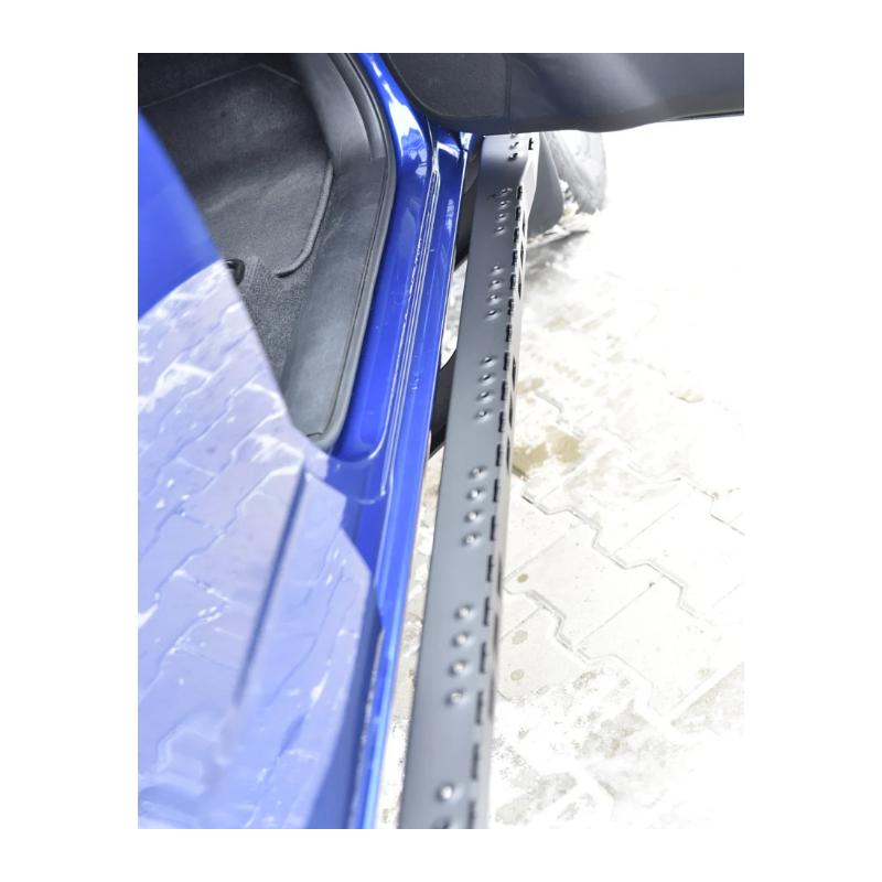 Slenksčiai patikimai tvirtinami prie visureigio rėmo apkabomis. Komplekte yra visi reikalingi tvirtinimo elementai.