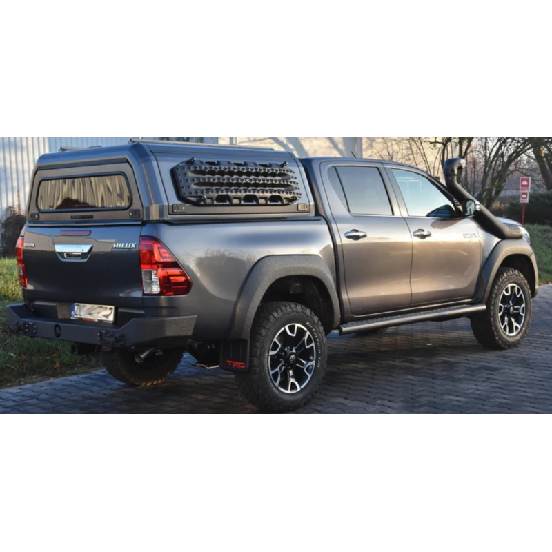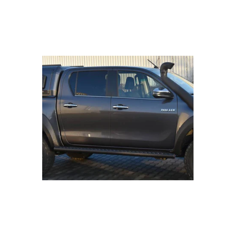 Sustiprinti plieniniai slenksčiai visureigiui Toyota Hilux Revo AN110, AN120, AN130 2015-2020. Slenksčiai leidžia kelti visureigį Hi-Lift tipo domkratais. Slenksčiai apsaugo automobilį nuo išsikišusių medžių šakų, akmenų ar kitų kliūčių kelyje. Taip pat jie padeda įlipti ir išlipti, o rifliuoto aliuminio paviršius apsaugo nuo paslydimo.