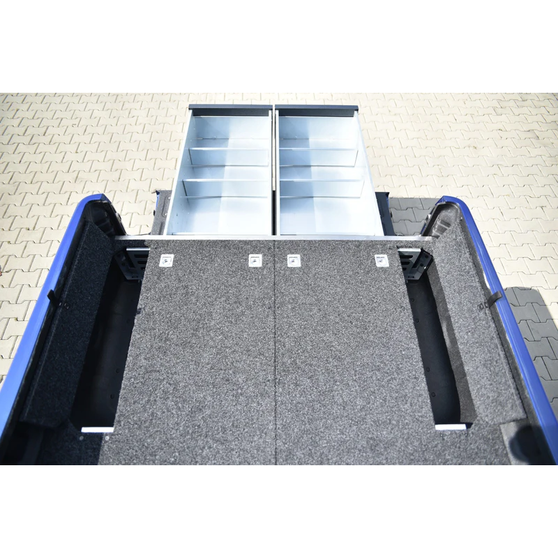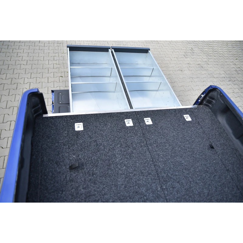 Bagažo stalčiai pagaminti iš cinkuoto plieno lakšto, kuris užtikrina gerą atsparumą korozijai. Stalčių mechanizmą sudaro nerūdijančio plieno sekcija su guoliais, sumontuotais tiek dugno, tiek viršaus, tiek stalčiaus šonuose, todėl važiuojant nėra pašalinių barškėjimo garsų. Kiekviename stalčiuje yra dvi vietos pertvarai, kurią galima naudoti priklausomai nuo jūsų poreikių. Abiejuose stalčiuose yra tvirtos nerūdijančio plieno spynos, kurias galima užrakinti raktu. Viršutinė dalis pagaminta iš faneros, padengtos audiniu, kuris aprėmintas aliuminio profiliu, todėl viskas gražiai dera su automobilio interjeru. Konstrukcija turi aštuonias atramas, kurios suteikia stabilumą apkrovoms, tokių kaip šaldytuvas ar bagažas ant jo paviršiaus. Taip pat and paviršiaus patogu įrengti miegojimo vietą. Šonuose yra papildomos sandėliavimo ertmės, kurios leidžia maksimaliai išnaudoti bagažinės erdvę.